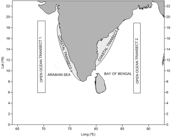 Arabian Sea and the Bay of Bengal. One open ocean and one coastal transect will be fixed for both the basins.