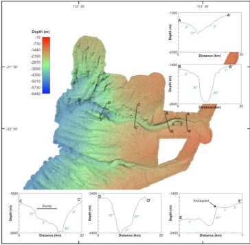 The proposed study site, the submarine Cape Range Canyon, has its upper reaches in a multiple use zone of the Gascoyne Marine Park, of which only 44% is mapped; very little is known about biodiversity in its deep water habitats (Daniell et al 2010). However, its lower reaches are close to a proposed mining lease, in a habitat protection zone, which prohibits mining. Understanding what biodiversity occurs in these zones is paramount to activating effective management processes. Figure with false-colour imagery of Cape Range Canyon (upper) and Cloates Canyon (lower).Representative profiles of the CRC show incised canyon morphology (A-D) and knick-point in upper reaches (e) (Daniell et al 2010).