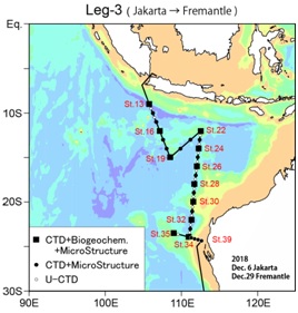 The target area of this cruise is the eastern Indian Ocean. There are two legs in this cruise (Leg-2 and Leg-3) that we conducted measurements. Leg-2 focuses the Bay of Bengal and equatorial eastern Indian Ocean, while Leg-3 observed in the regions of the Indonesian throughflow and Ningaloo Nino/Nina between Indonesia and Australia. The following figures indicate the cruise tracks and locations of observation stations.