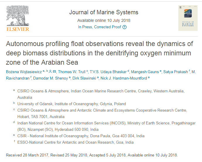 24 | Autonomous profiling float observations reveal the dynamics of deep biomass distributions in the denitrifying oxygen minimum zone of the Arabian Sea. | 2018 | ![]() |