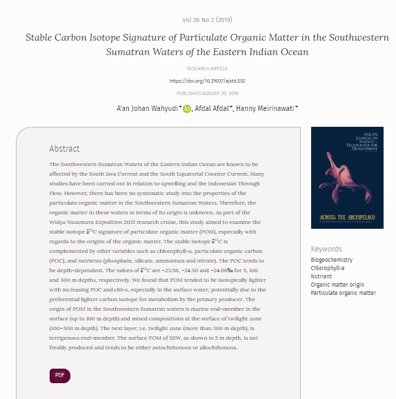 14 | Stable Carbon Isotope Signature of Particulate Organic Matter in the Southwestern Sumatran Waters of the Eastern Indian Ocean | 2019 | ![]() |