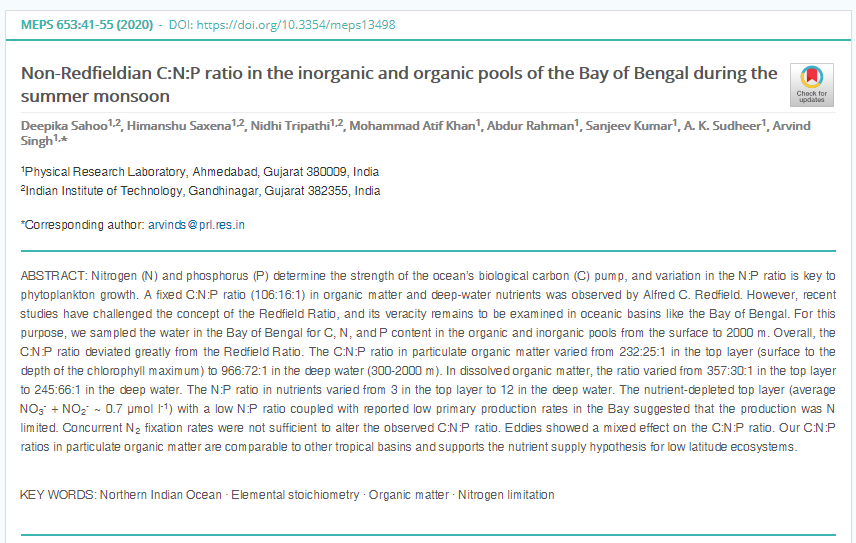 11 | Non-Redfieldian C:N:P ratio in the inorganic and organic pools of the Bay of Bengal during the summer monsoon | 2020 | ![]() |