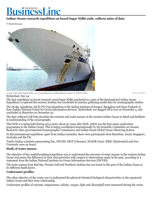Indian Ocean research expedition on board SagarNidhi ends, collects mine of data , The Hindu-Business Line, December 24, 2015